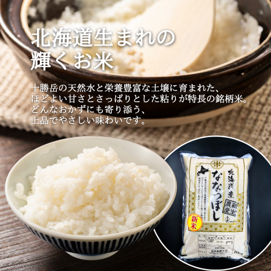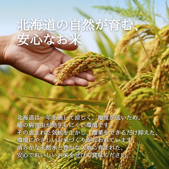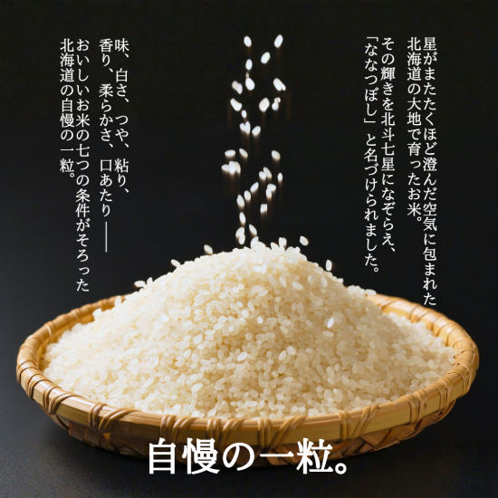 十勝岳の天然水と栄養豊富な土壌ではぐくまれたほどよい甘さとさっぱりとした粘りが特徴の銘柄米です。
